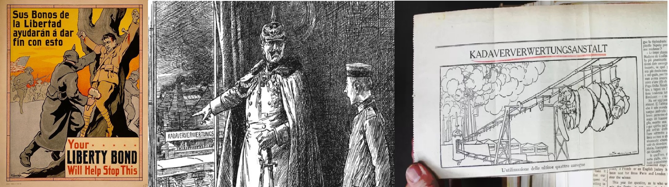 Один из самых запомнившихся эпизодов первой пропагандистской войны — история о распятом немцами канадском офицере, растиражированная английской прессой. Англичане с самого начала войны отнеслись к пропагандистской составляющей серьёзнее, чем все остальные участники, и к тому моменту, как немцы поняли, что происходит, большая часть света уже считала их гуннами, которыми изображала их английская пропаганда. В пропагандистском аппарате трудились почти все сколько-нибудь известные писатели, тогда как у немцев пропаганду отдали на откуп непрофессионалам, что сразу же стало заметно.