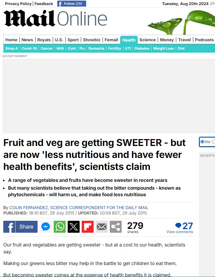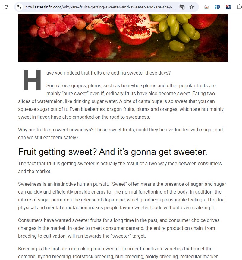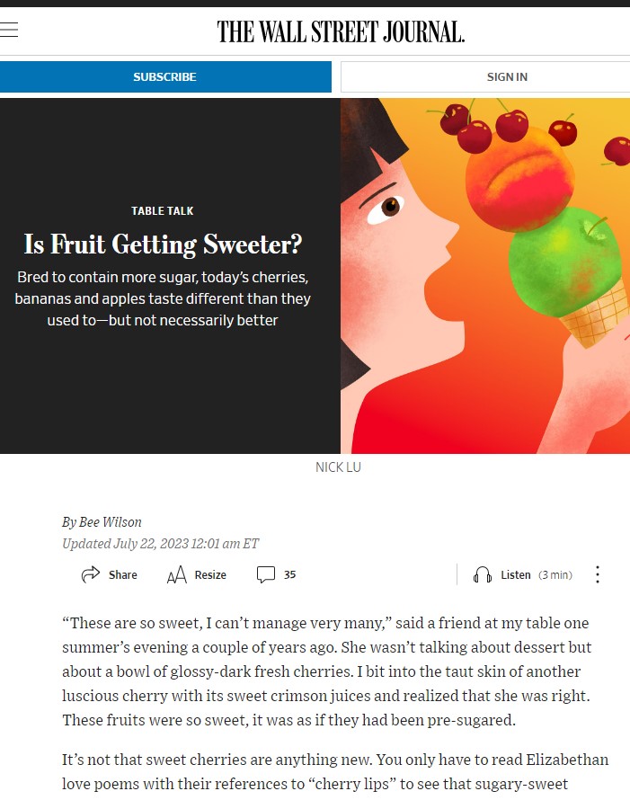 Ну вот на сайтах, что сейчас смотрю, грешат на покупателей: люди берут те сорта, что слаще, из-за чего торговые сети другие сорта не закупают, из-за чего аграрии избавляются от традиционных сортов и выращивают те, что послаще, а селекционеры выводят еще более ходовые, то бишь сладкие, сорта. Противоестественный отбор, как говорил Дарвин. В итоге вон австралийские зоопарки прекращают кормить зверюшек фруктами, а то здоровье подорвать недолго, а они денег стоят.