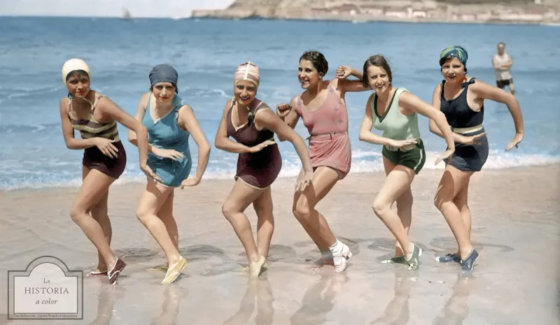 Купальщицы позируют на пляже Ла Конча в Сан-Себастьяне, 1930 год. (А вот Сан-Себастьян в 2014 году.)