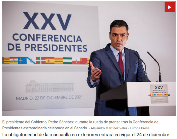 Испания встречает штамм оксимирон (или он вроде омикрон?) во всеоружии. Премьер-каброн Санчес посчитал, что люди стали забывать о его великой роли в борьбе со страшным злым коронавирусом, поэтому собрал совещание, на котором огласил новые эпохальные решения, благодаря которым Испания не вымрет от оксимирона, как она не вымерла от предыдущих штаммов, потому что Санчес вовремя всех запер по домам без права выхода на улицу, а потом вводил комендантские часы и запреты покидать границы города по выходным.