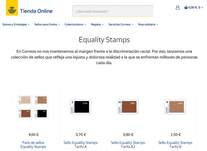 На сайте испанской почты стали продавать однотонные марки разных цветов в целях борьбы с расизмом.