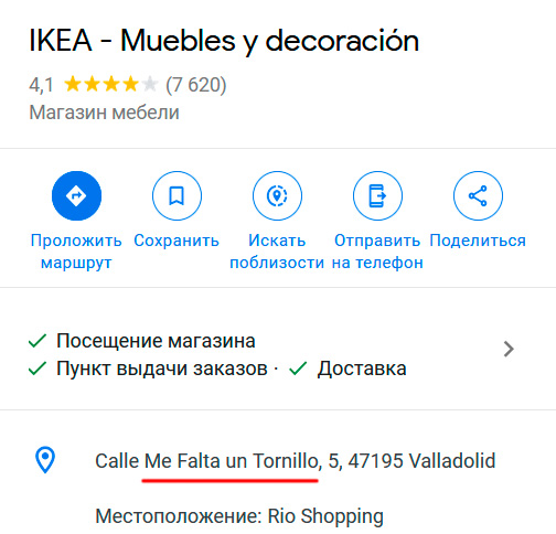 Магазин "ИКЕА" в Вальядолиде находится на улице "Me Falta un Tornillo", что дословно переводится как "у меня закончились винтики", и одновременно это идиома, означающая что-то вроде "я слегка с головой не дружу" (аналог "в голове не хватает винтиков" в русском языке).