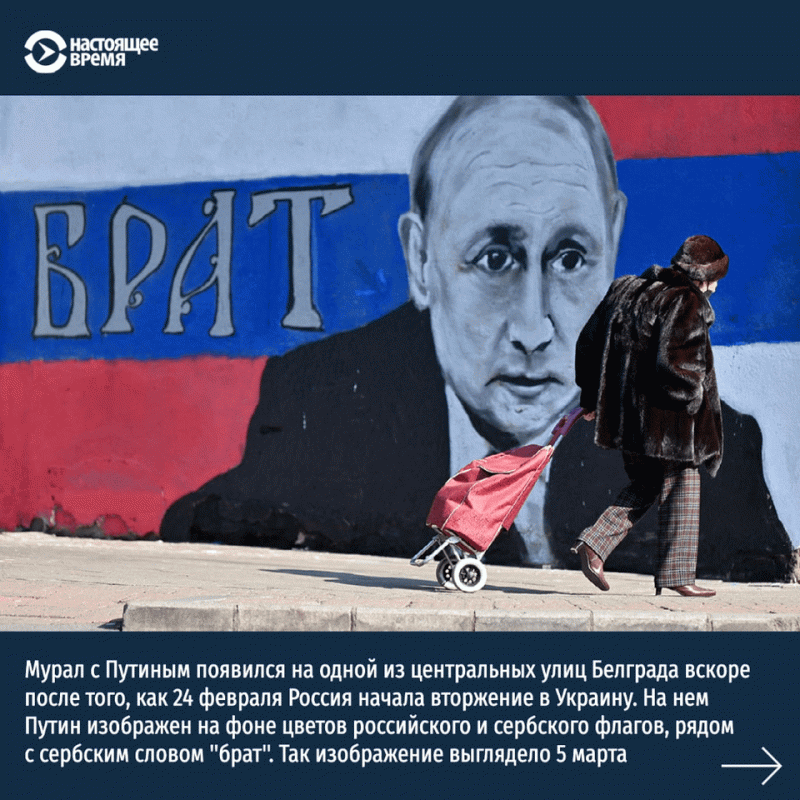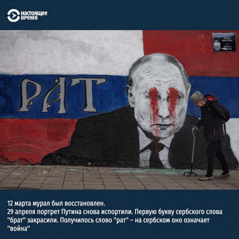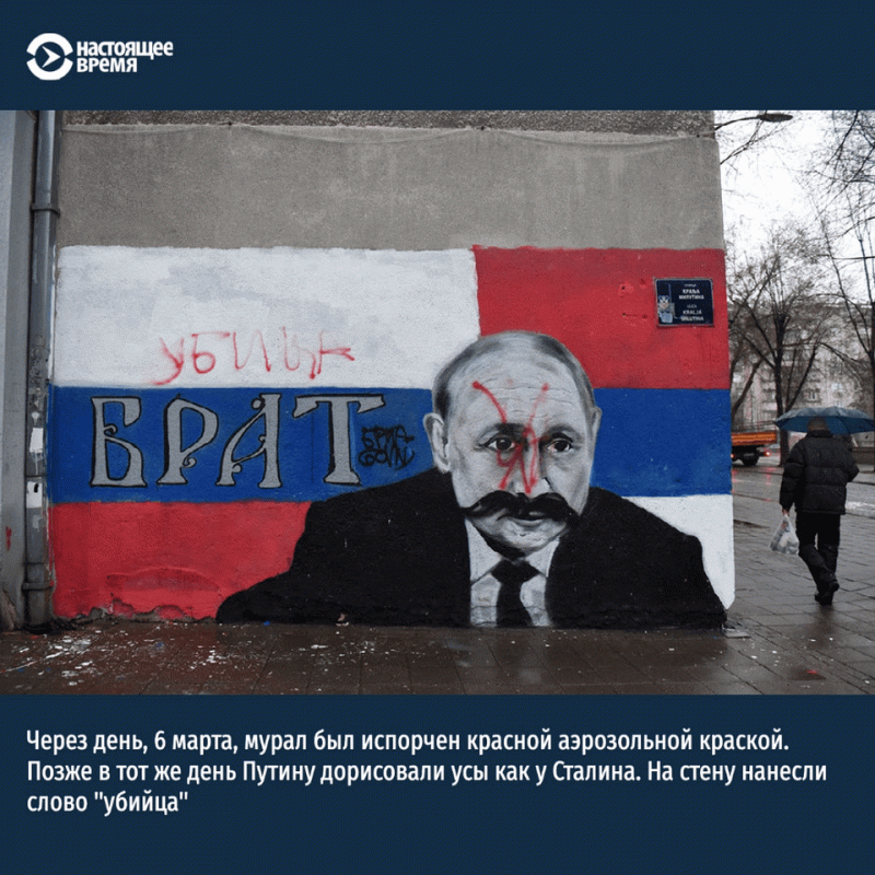 Мурал с Путиным появился 5 марта на одной из центральных улиц Белграда (Сербия) после чего мурал претерпел ряд последовательных превращений - отсюда.