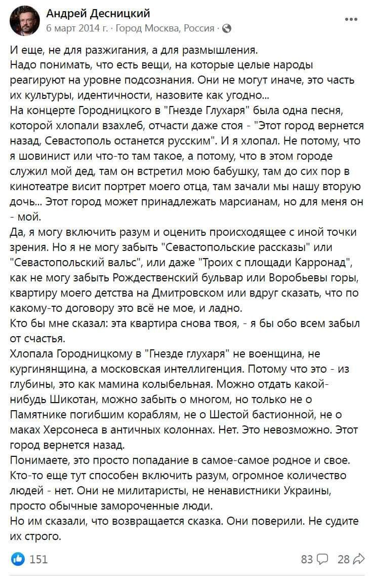И в посте Алекса есть ссылка на статью Аврамчука. Почитайте. Там же есть о Крыме и о причинах почему дружба с рашистом Десницким закончилась.