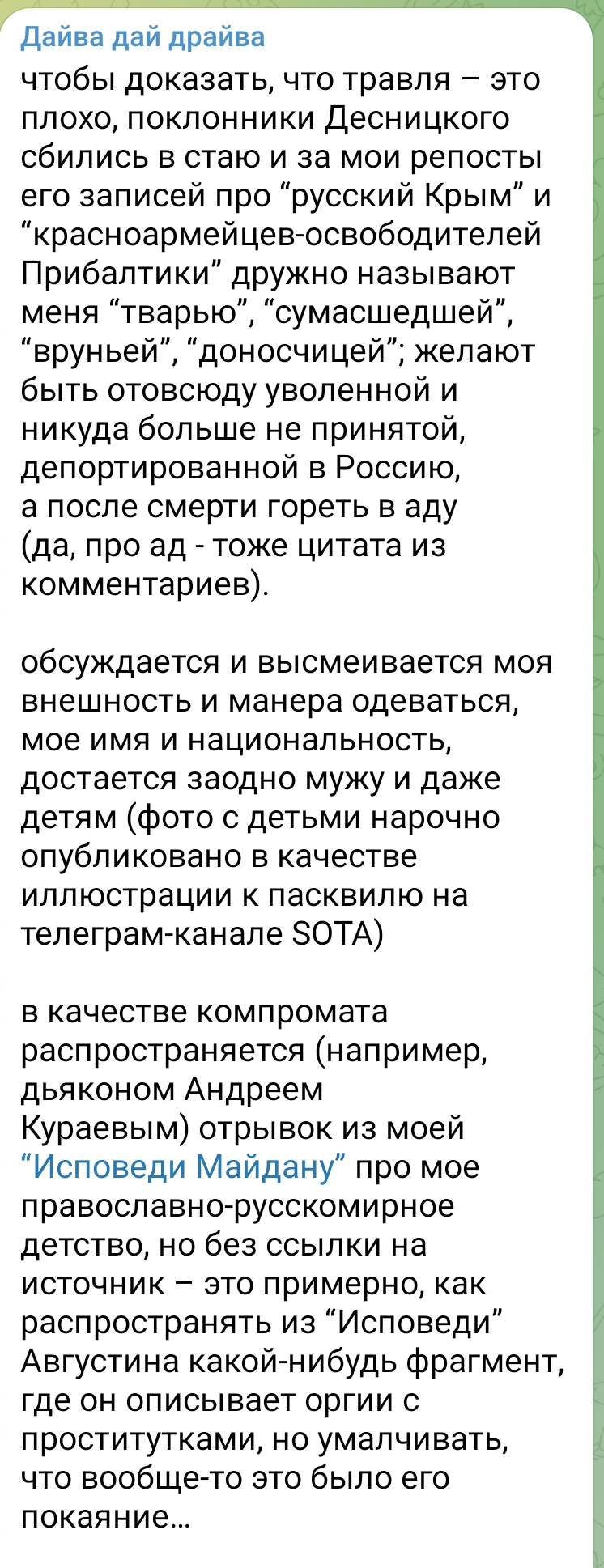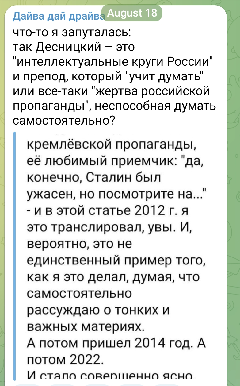 В общем, совершенно четко понятно, что никакой Десницкий не белый и не пушистый, что он сам был проводником путинской пропаганды (в чем его в той же статье обвиняет издатель из Украины Евгений Аврамчук, который с Десницким когда-то дружил), а следовательно - он причастен к разжиганию этой безумной войны.