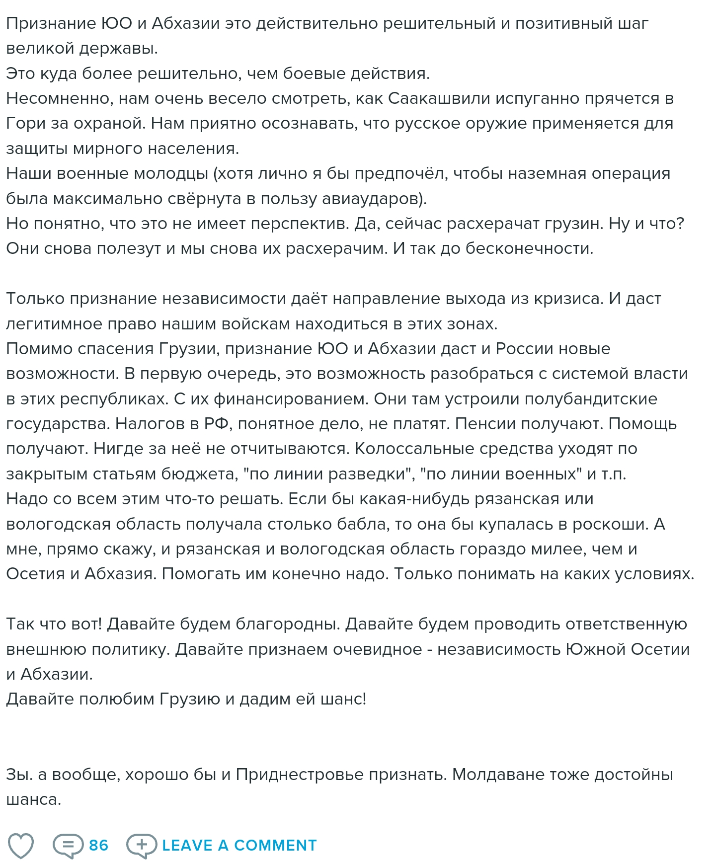 И, разумеется, ни о какой "святой обязанности" в посте речи нет. Автор говорит, что желание "вернуть" Крым естественно для русского человека (у меня его не было, наверное я плохой русский), но радоваться тому, что это произошло, можно только если не включать разум.