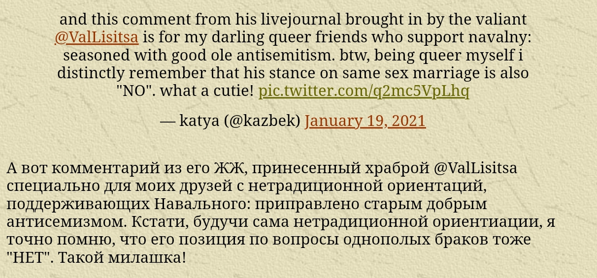 По поводу его слов о "пидорах и жидах" обратитесь к пользователю твиттерa, упомянутого на скрине ниже, это в дискуссии с ним ваш светоч раскрылся, а поиска по комментариям в ЖЖ не существует. Ну и что именно за антисемитизм ЖЖ засуспендил аккаунт navalny вы тоже не знаете?