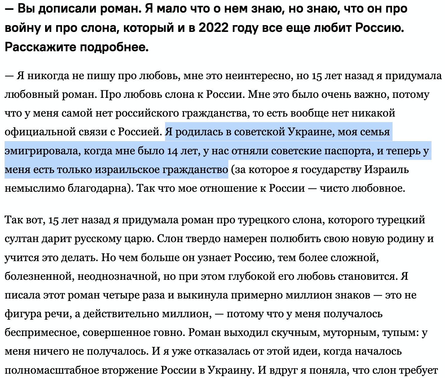 При всём при этом она считает себя русской писательницей, пишет книги про Россию.