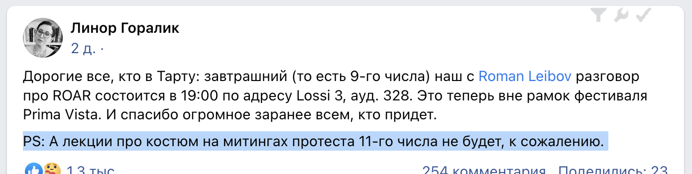 "Понимаете, мы живем действительно в ситуации моральной паники. В первую очередь это касается конечно украинцев, которые страдают от войны. Я совершенно не готов сейчас обсуждать их отношение к Линор Горалик. Однако моральная паника моральной паникой, но должна быть какая-то ответственность. Я очень взволнован и очень зол. Поэтому не хочу ничего больше говорить о фестивале Prima Vista", - резюмировал Лейбов. (Отсюда.)