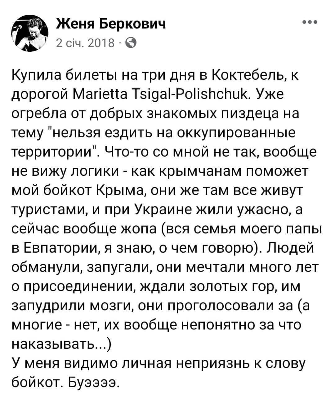 В этом самом скриншоте она пишет, что и при Украине была жопа (что в целом более-менее правда) – но что теперь, при РФ, жопа ещё больше (а вот это уже точно факт), и что всех крымчан на*бали, мягко говоря.