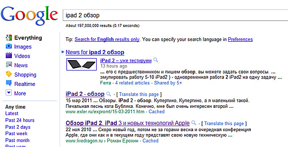 Не вижу. По запросу "iPad 2 обзор" у меня вообще нет на 1 странице. Вот если набрать "iPad 2 - обзор" - тогда сразу на первом.