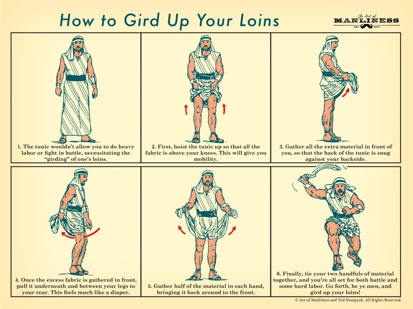 Кстати, на случай, если ты, как подобает мужчине, в платье, а надо срочно подраться, то Ветхий Завет рекомендует "препоясать чресла". Все читали, не все знают, как их в ту пору препоясывали:
