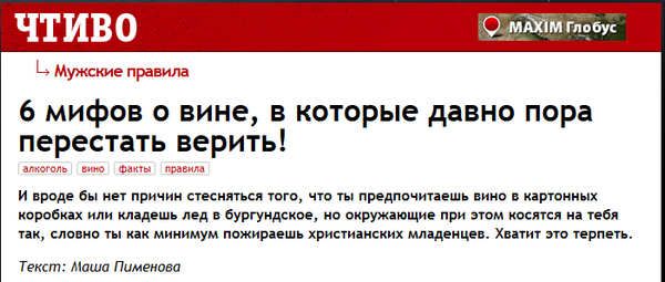 Помнится, в заметке о фридайвинге они там как-то дали всего-то смертельно опасный совет (на фоне всяких смехуёчков). А нынче разродились статьей "6 мифов о вине, в которые давно пора перестать верить!" авторства некоей Маши Пименовой, ну и я не мог это дело не прочитать - интересно же. А вдруг я верю в какие-то мифы о вине - Маша мне и раскроет глазенки, правильно?
