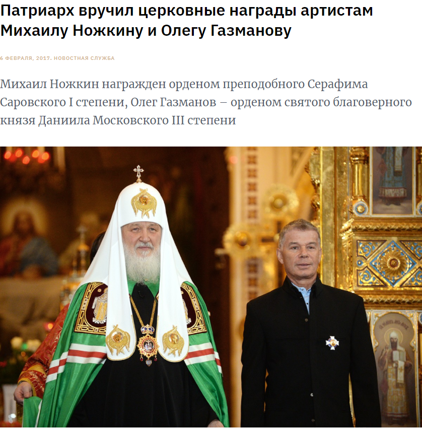 "Олег Газманов получил орден святого благоверного князя Даниила Московского III степени «во внимание к трудам на благо Церкви и Отечества и в связи с 65-летием со дня рождения»."