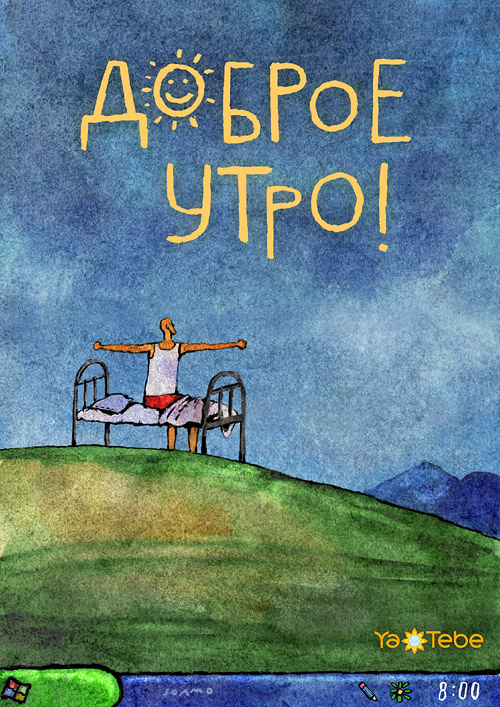Да... Утро действительно доброе , судя по обозначенному времени на картинке. Подъём в 8:00 утра - это не в 5:00 . И солнышко светит, а не луна. Есть чему радоваться 😄