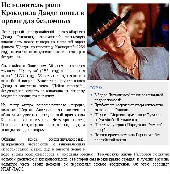 Статья "Исполнитель роли Крокодила Данди попал в приют для бездомных". Привожу ее целиком, как сейчас на сайте.