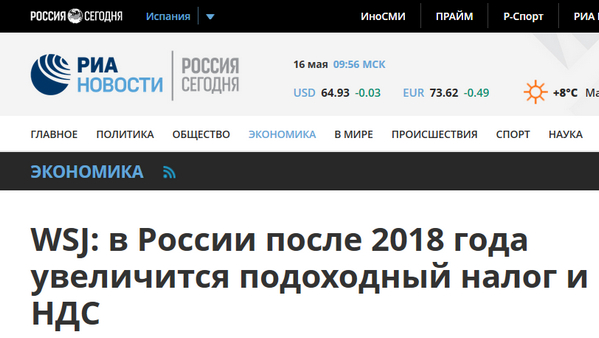 А теперь медленно и по буквам. "РИА Новости" сообщает, что, как сообщает газета Wall Street Journal, в России после 2018 года увеличится подоходный налог и НДС.