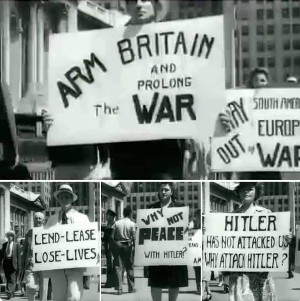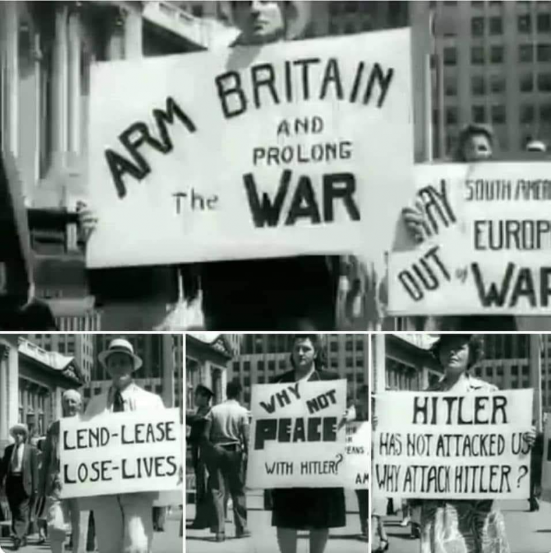 Антивоенная демонстрация. Вооружение Британии - это продолжение войны. Почему бы не заключить мир с Гитлером!!? Он же на нас не нападает, правильно? Не злите Гитлера, это спровоцирует новые жертвы. Ленд-лиз - терять жизни!