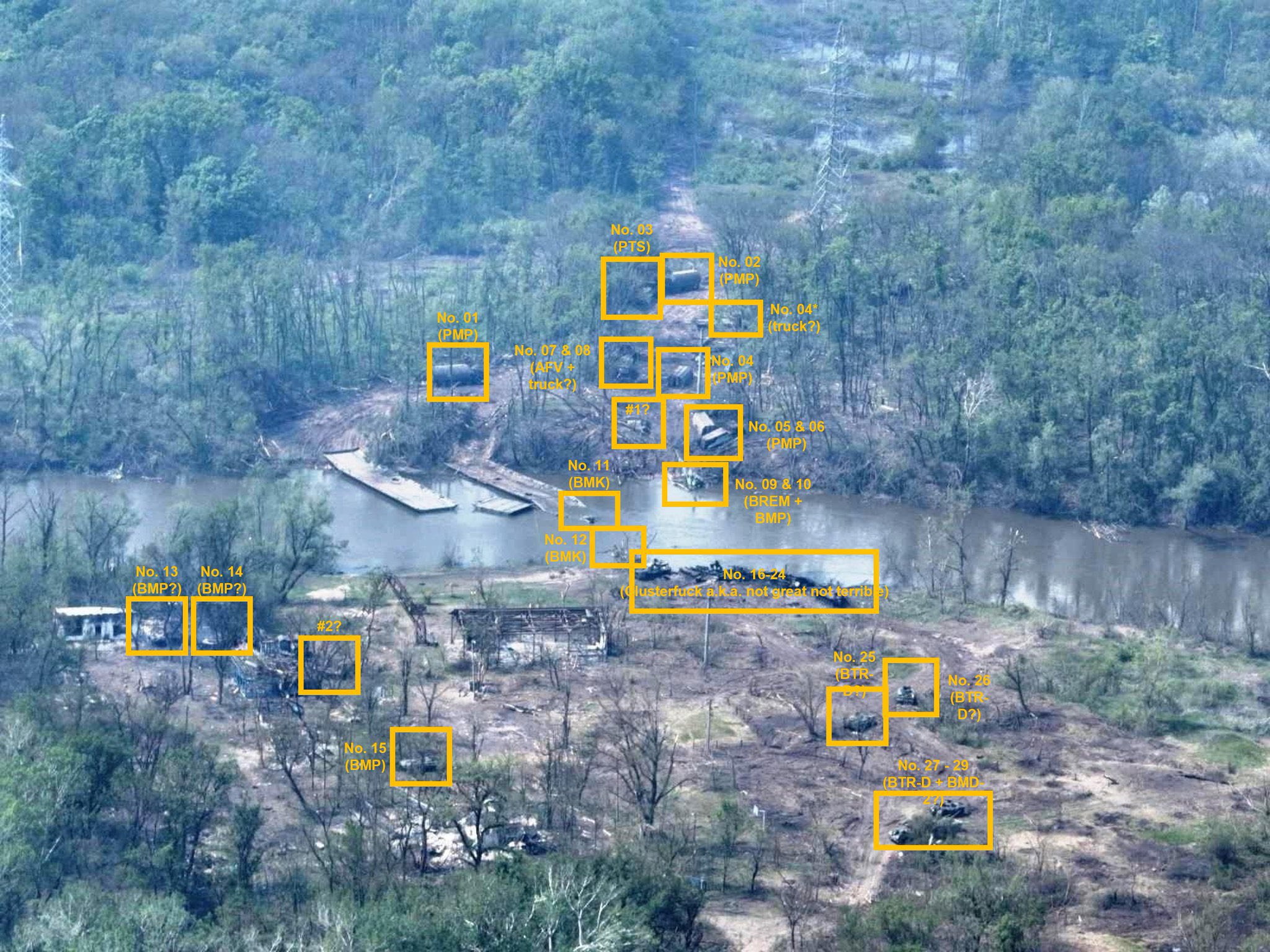 В месте переправы посчитали точно технику по фото. В результате боевых действий было уничтожено или бросили 73 единицы боевой техники российской армии. Танки, бтр, бмп, мтлб и т д