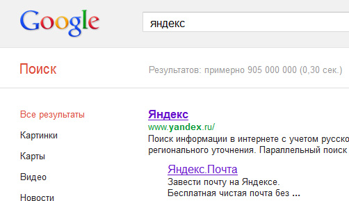 На яндексе напротив ссылка на сам Гугл слева стоит циферка 1. То бишь выдача в первой строке. А все что выше - это так... контекс...как ее там...ная ссылка.