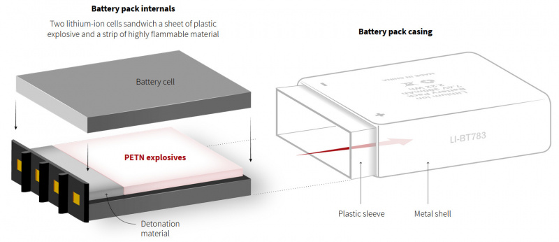 Агенты, создавшие пейджеры, разработали батарею, в которой скрывался небольшой, но мощный заряд пластиковой взрывчатки, и новый детонатор, невидимый для рентгеновского излучения.