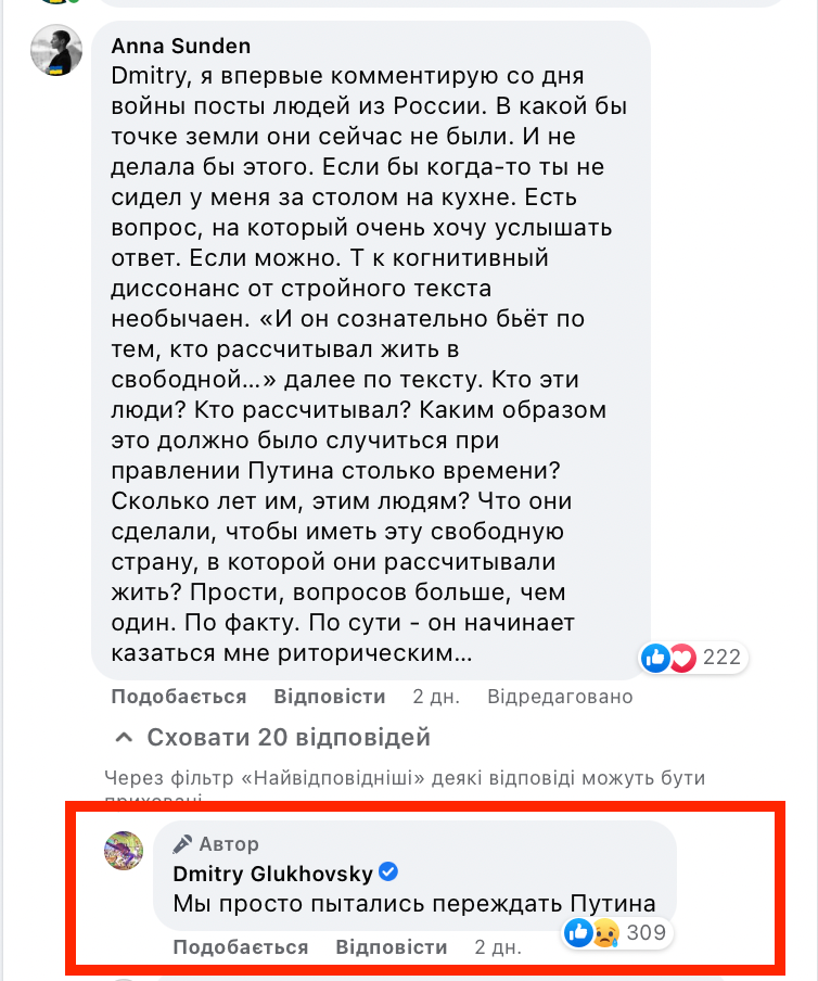 Разрыв прошел через миллионы семей – старшее поколение принимает похожую на фотографический негатив картину мира, до хрипоты споря и ссорясь со своими молодыми родственниками, для которых подлог и вранье очевидны. Путинская пропаганда, которая ответственна за психоэмоциональную подготовку и оправдание братоубийственной и захватнической войны против Украины, опять оказывается невероятно эффективной, даже когда ее ложь, казалось бы, должна резать глаза любому.