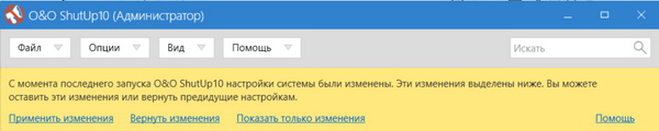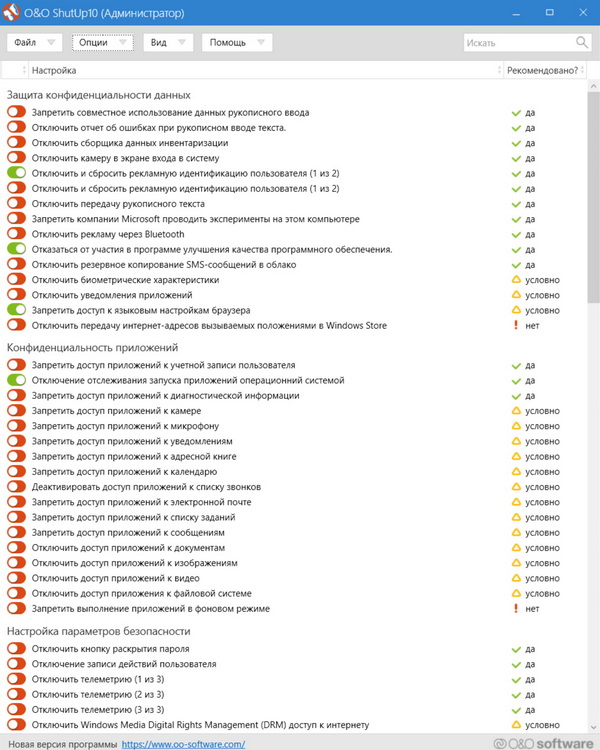 Программа сама предлагает сделать рекомендуемые настройки (Опции - Применить все рекомендованные настройки). Также вы можете самостоятельно выбрать те настройки, которые вам нужны. После применения настроек и перезагрузки программа может отследить, какие параметры Windows самовольно переключила обратно.
