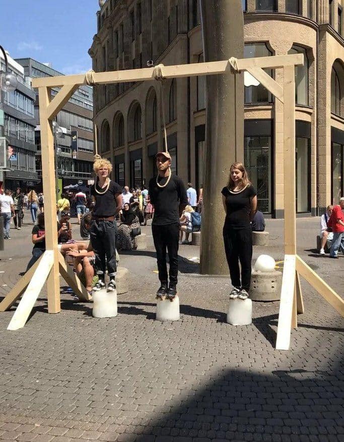 Активисты то ли "Гринпис", то ли "Блюлай", то ли еще какой-то террористической экологической организации в Кельне пытаются донести до граждан мысль о том, что... Как вы думаете, какую мысль они хотят донести? У них под ногами цилиндры изо льда. Я думаю, они хотят донести до людей мысль о том, что если температура окружающей среды выше, чем температура таяния льда, то лед растает. Бра-во, мо-лод-цы!