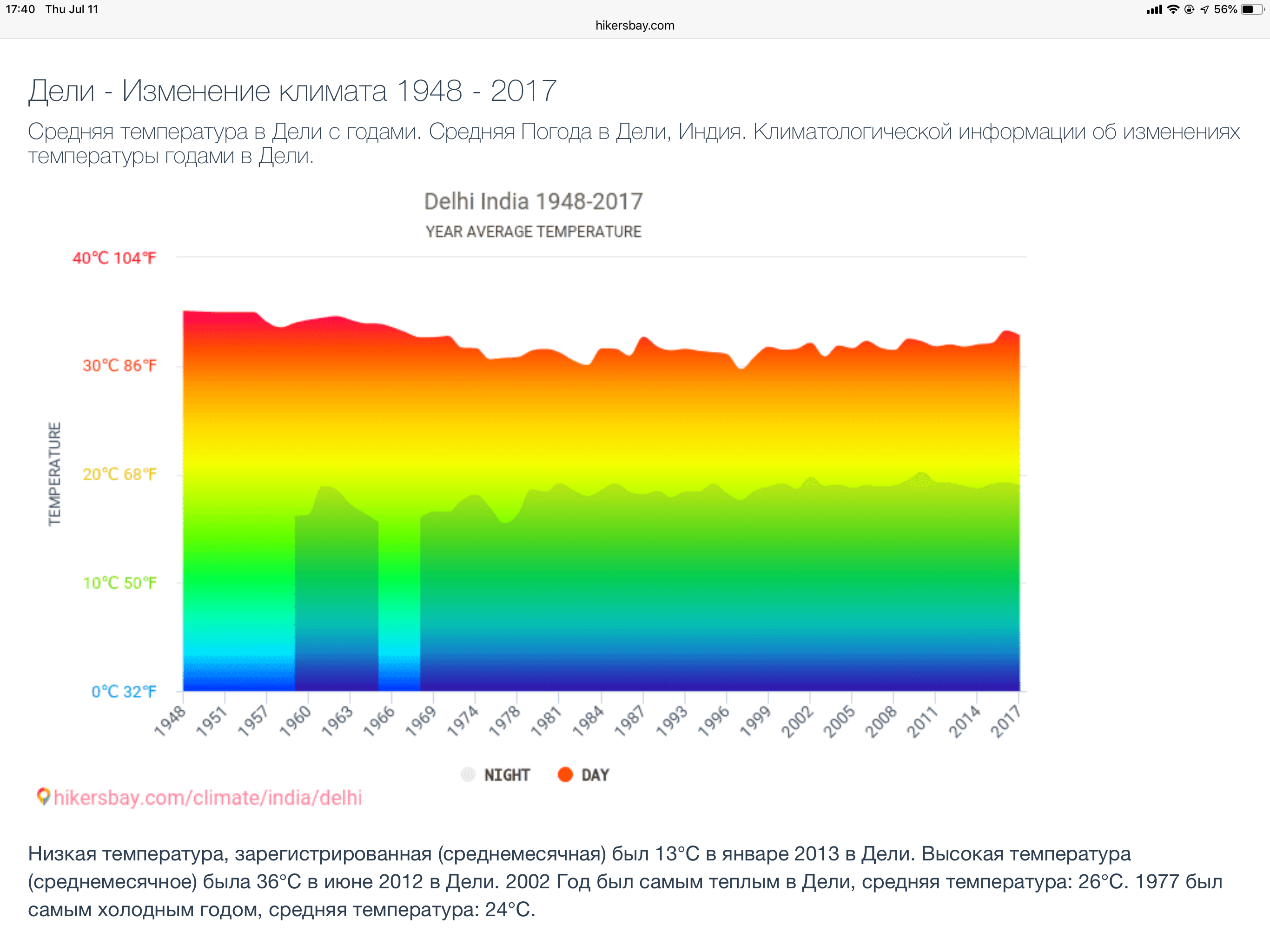 И что? Слабо оказалось выложить температурные графики? Вот такими тухлыми аргументами сторонники ьеории ГП сами себя и дискредитируют. Я вот не поленился нарыл один график для Дели. На данном графике никаких видимых глазу долгосрочных трендов повышения температуры не просматривается, есть лишь обычные межгодовые флуктуации в пределах пары градусов. Только не надо говорить что это нерелевантный город и что Индия большая страна. Приведите данные для других регионов Индии. Это же вы отстаиваете теорию а не я, бремя доказательства теории лежит на плечах тех, кто ее поддерживает.