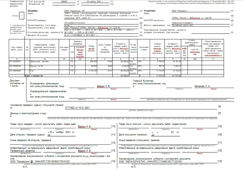 Выделить НДС при покупке топлива, а значит — получить налоговый вычет в размере 20% с топливными картами «Процессинг24» можно просто и без лишних бухгалтерских заморочек. Раз в месяц сервис направляет клиенту УПД (универсальный передаточный документ), на основании которого юридическое лицо может получить налоговый вычет в размере 20%.