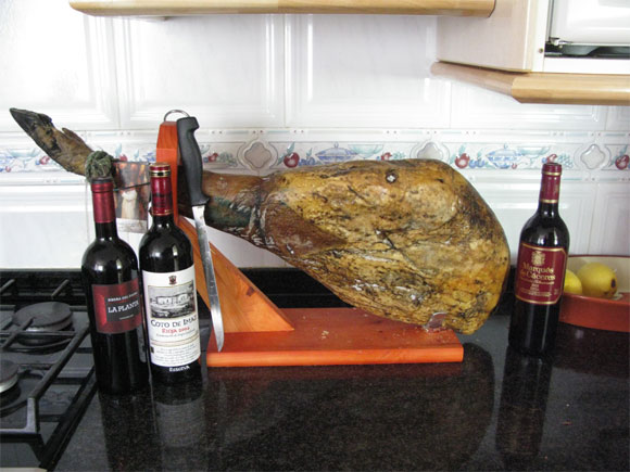Попробовал. И вот это уже - офигенно вкусно. С самым дешевым вообще сравнивать нельзя! По сравнению с Iberico Cebo Villar - намного вкуснее, а главное - намного нежнее. Даже не верится, что это вяленое мясо - хамон просто тает во рту. И стоит вполне разумно - 159 евро за ножку килограммов в восемь. Я ее вчера еле дотащил - не удержался, купил, конечно.
