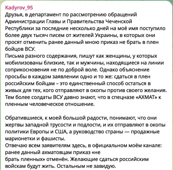 Рамзан Кадыров после того как неизвестно чей дрон (есть слухи, что он прилетел вовсе не из Украины, а из Дагестана) прилетел в Университет спецназа в Чечне имени Путина, расположенного в Грозном недалеко от района имени Путина, заявил, что дал приказ бойцам "Ахмата" не брать в плен солдат ВСУ.