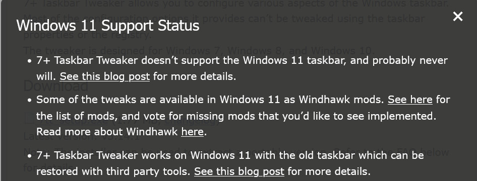 Я лично системных твикеров нажрался по горло, всегда что-то ломают капитально рано или поздно. А вот одна из новостей про taskbar app ungrouping в 11 (о чём изначально и хотел написать). Будет в 23H2.