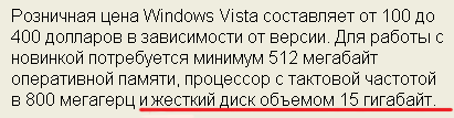 Ага, ага, поставьте Vista на 15-гиговый диск - я с удовольствием посмотрю, как у вас это получится. Vista никак не встанет на 15-гиговый диск - просто по определению. На самом деле диск должен быть минимум 40-гиговый, а 15 гигов на нем должны быть полностью свободны, чтобы Vista хотя бы встала. Но в реальности, понятное дело, требования значительно выше - то, что заявляется как минимум (800 МГц процессор и 512 мегов) - это из серии "только посмотреть". Нормально работать на таком комплекте нельзя. Да и из заявленных самим производителем продвинутых требований (Vista Premium) тоже есть элемент лукавства - как показывает практика, 1 Гига памяти никак не хватит, нужно минимум полтора, а лучше два, ну и видеокарта должна поддерживать не только DirectX 9.0, а еще и DirectX 10.0, который пока мало кто поддерживает. Иначе всей заявленной прелестью (Aero и так далее) ни черта не насладиться.