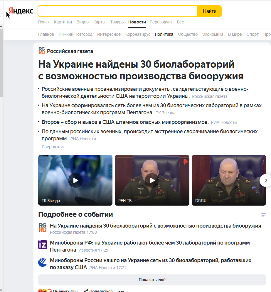 Ну дык им же надо как-то все-таки Макрону объяснять, почему они там. Вот ЯО не нашли, даже при большом желании (хотя может быть просто у Патрушева все-таки действительно проявились остатки подобия совести). Тогда пришлось обычные больничные и университетские биологические лаборатории выдавать за вот это самое...