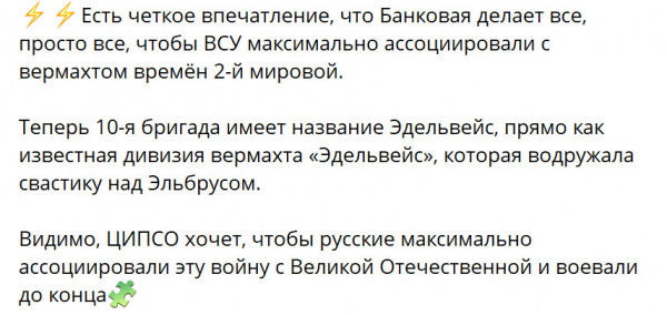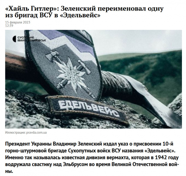 "Режим Зеленского продолжает демонстрировать кощунство и свою нацистскую суть. Украинская бригада "Эдельвейс" – это эхо фашизма. И получила она свое наименование, видимо, за усердие, проявленное в уничтожении мирных граждан и инфраструктуры мирных городов", - сказал РИА Новости Шеремет. (Отсюда.)