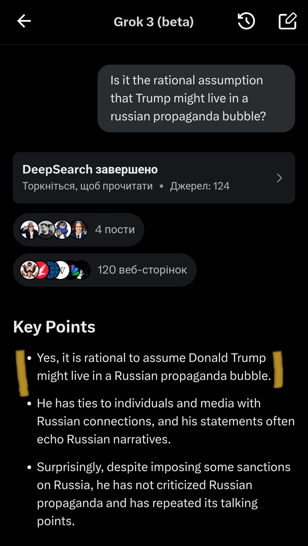 А если серьёзно, никогда не было сомнений что Трамп симпатизирует российскому "президенту", все эти сказки на ночь от русскоязычных трампистов что Трамп это плохие новости для Кремля ни на секунду не вызывали во мне никаких сомнений, Дональд Трамп предаст Украину и я был в этом уверен. Но всё-таки я изумлен скоростью с которой он это делает. Почему-то думал что будет более хитёр, не спеша, не так очевидно. А его прям понесло, буквально за пару месяцев во все тяжкие ушёл, как будто работает на первом канале, словно очередной гость в программе Соловьёва. Как будто он смотрелся бы не чужеродным телом среди Гурулёва и Шахназарова. Это конечно несколько удивляет.