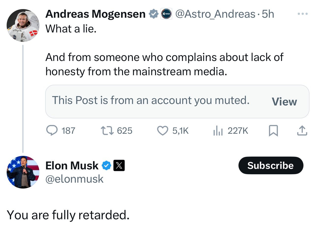 > Датский астронавт Андреас Могенсен, который буквально летал на Crew Dragon от SpaceX в составе экипажа Crew 7 и ещё недавно был командиром МКС, говорит, что Маску не стоило так врать.