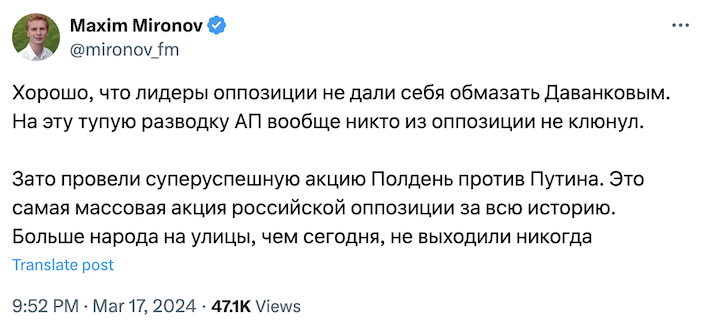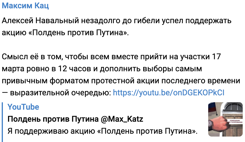 Стоит обратить внимание не на то, что сказано, а на то, что не упомянуто. Нет слова о войне. О борьбе, не сводящейся к болтовне (саботаж, не ходить в армию, не работать на войну и т.д.). Нет упоминания конкурентов из числа оппозиции. Только ежедневно молиться по 15 минут на ФБК.