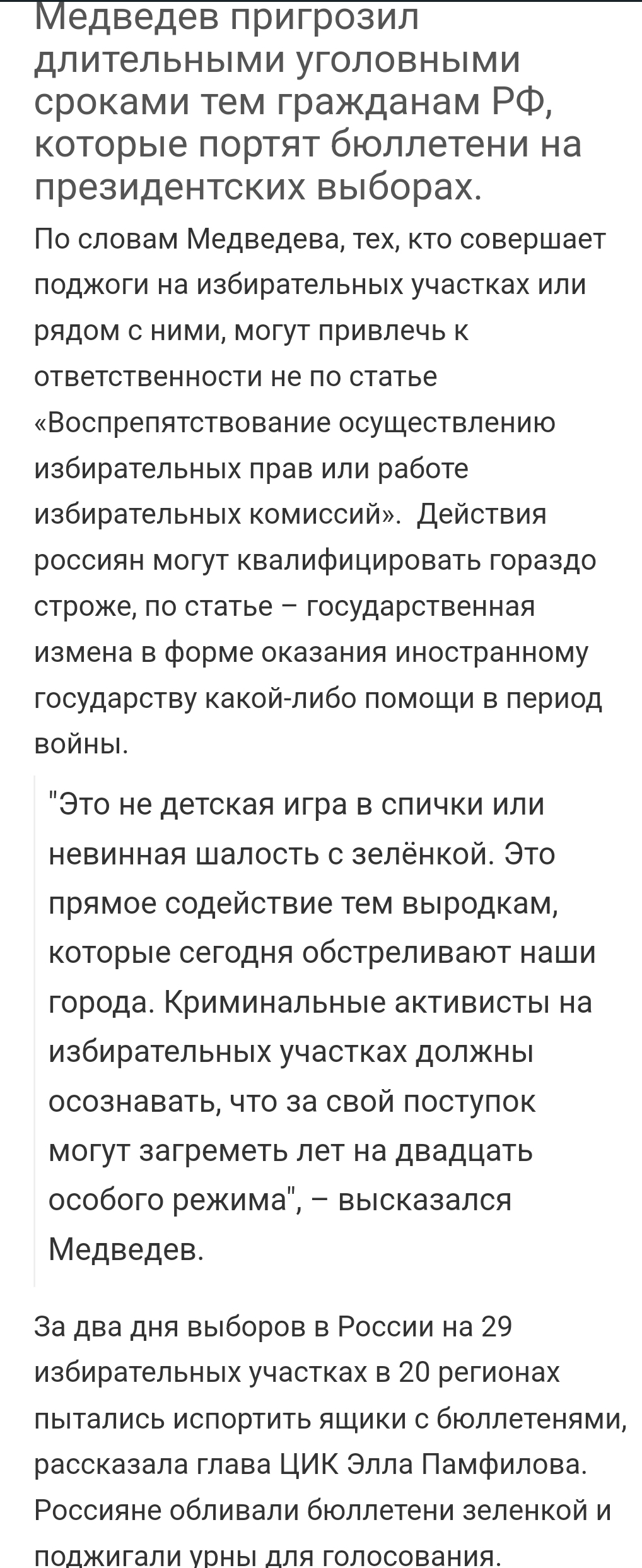 А попытки поджогов избирательных участков, которые самим участкам сильно навредить не могут, зато поджигателю тоже светит тюрьма, а кроме того, пришедшие на участок люди могут получить ожоги. И на что тут расчет - на то, что Путин загрустит?