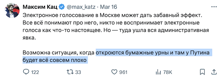 С тех пор, как всё большее число людей стали загонять в электронное голосование, каждый раз гордо отчитываясь: "настолько-то большее число людей проголосовало электронно, чем бумажно" - у меня возникло ощущение, что конечная цель вообще отменить бумажные выборы. Электронный бюллетень невозможно испортить, удобно фальсифицировать.