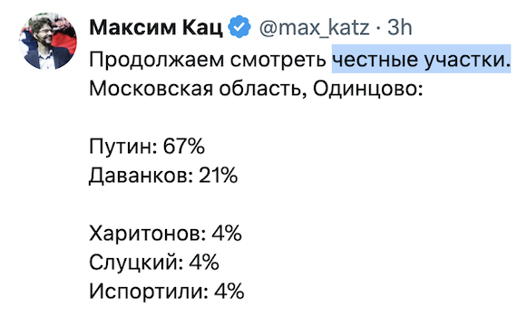 Кто-нибудь вообще понимает, какой в этом смысл? Заливать бюллетени зеленкой, с угрозой получить за это действие до пяти лет тюрьмы, а что это вообще дает-то? Только то, что все залитые бюллетени посчитают за Путина, независимо от того, что на них написано? Светлая цель, да.