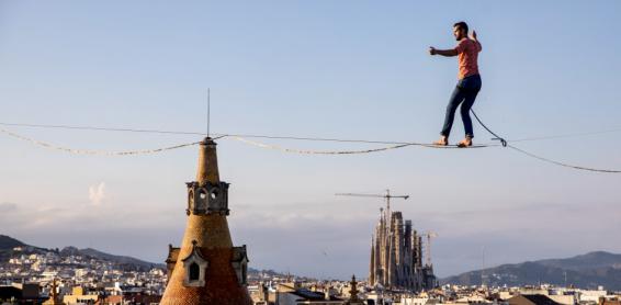 Вчера, в воскресенье, многие жители Барселоны стали свидетелями очень необычного зрелища: на высоте 70 метров от земли некий мужчина шел босиком по стальному тросу, протянутому над улицей Пасеиг-де-Грасия от здания Telefónica до здания Generali.