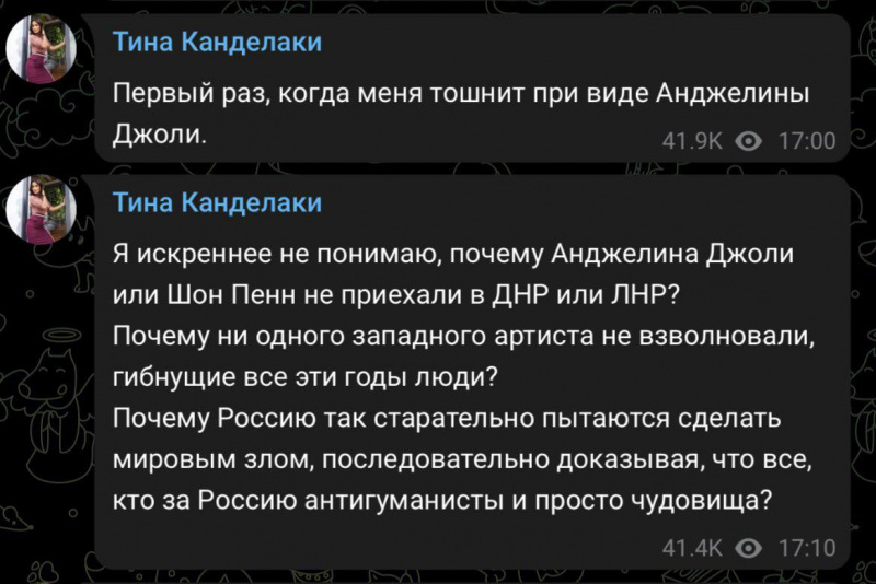 Канделаки тошнит от Анджелины Джоли. (Сколько народу тошнит от самой Канделаки - она не задумывается.) Канделаки искренне не понимает, почему Анджелина Джоли или Шон Пенн не приехали в лугандон пообщаться со всякими присланными из России бандитами, со всеми этими гиркиными, гиви, моторолами и прочей мразью. Почему не приехали - непонятно совершенно. Странные они какие-то.