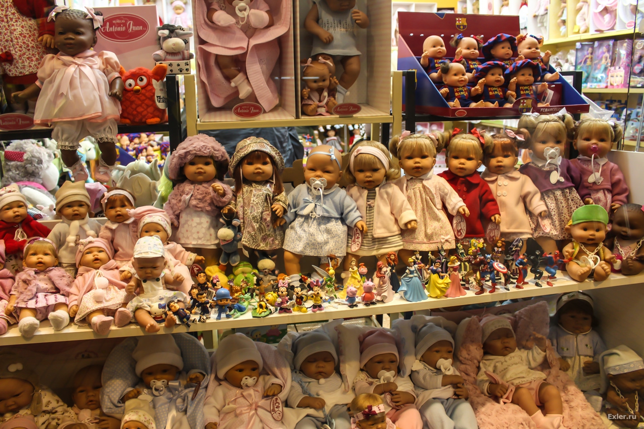 Реальный шок. Витрина магазина с куклами, причем только минимальная их часть одета в форму Барсы - Футбольного клуба Барселоны. Вон они, справа сверху. А вот почему не все куклы в этой форме - непонятно совершенно.