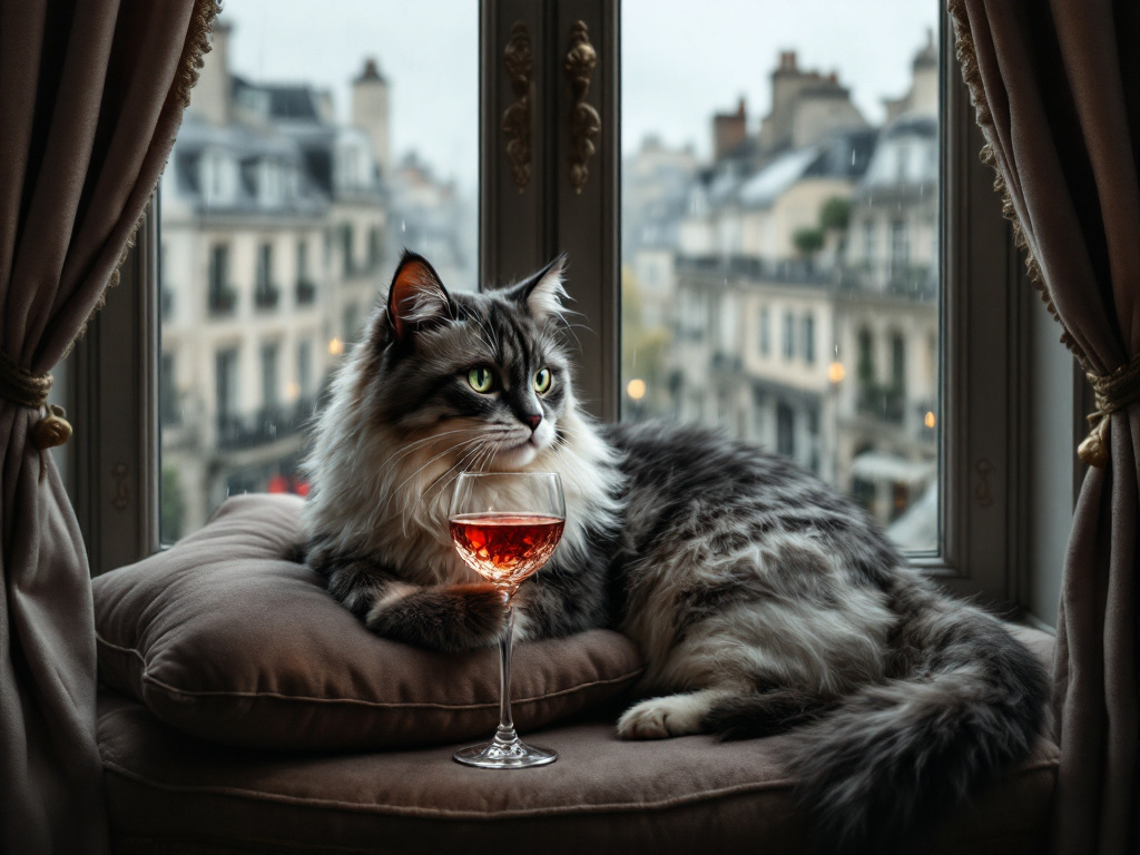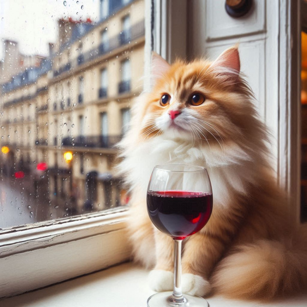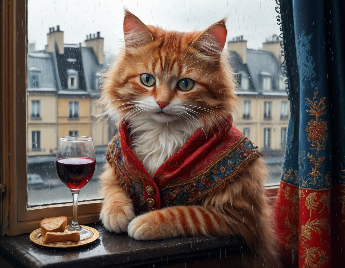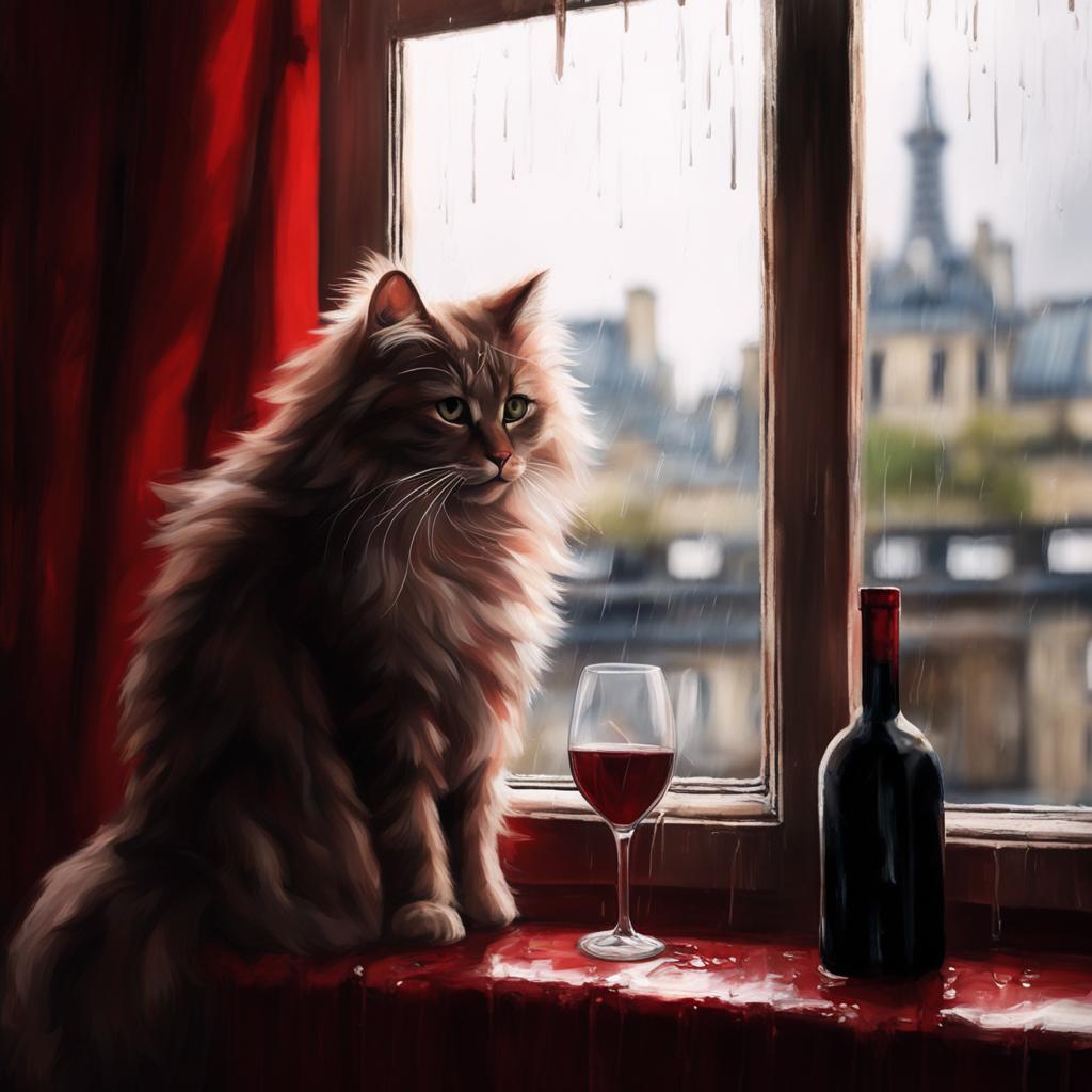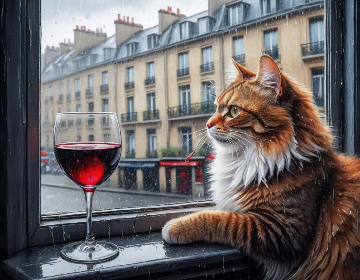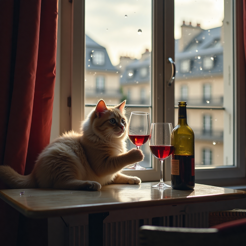 "Generate a realistic image of a fluffy and playful cat sipping red wine by a window on a rainy day in Paris".