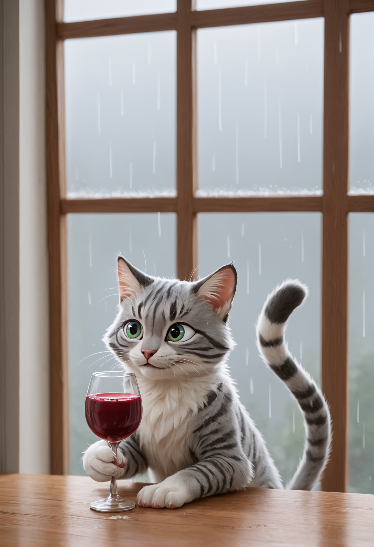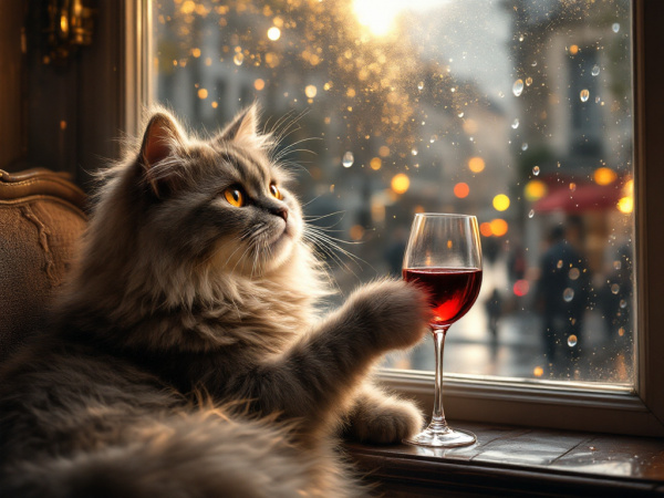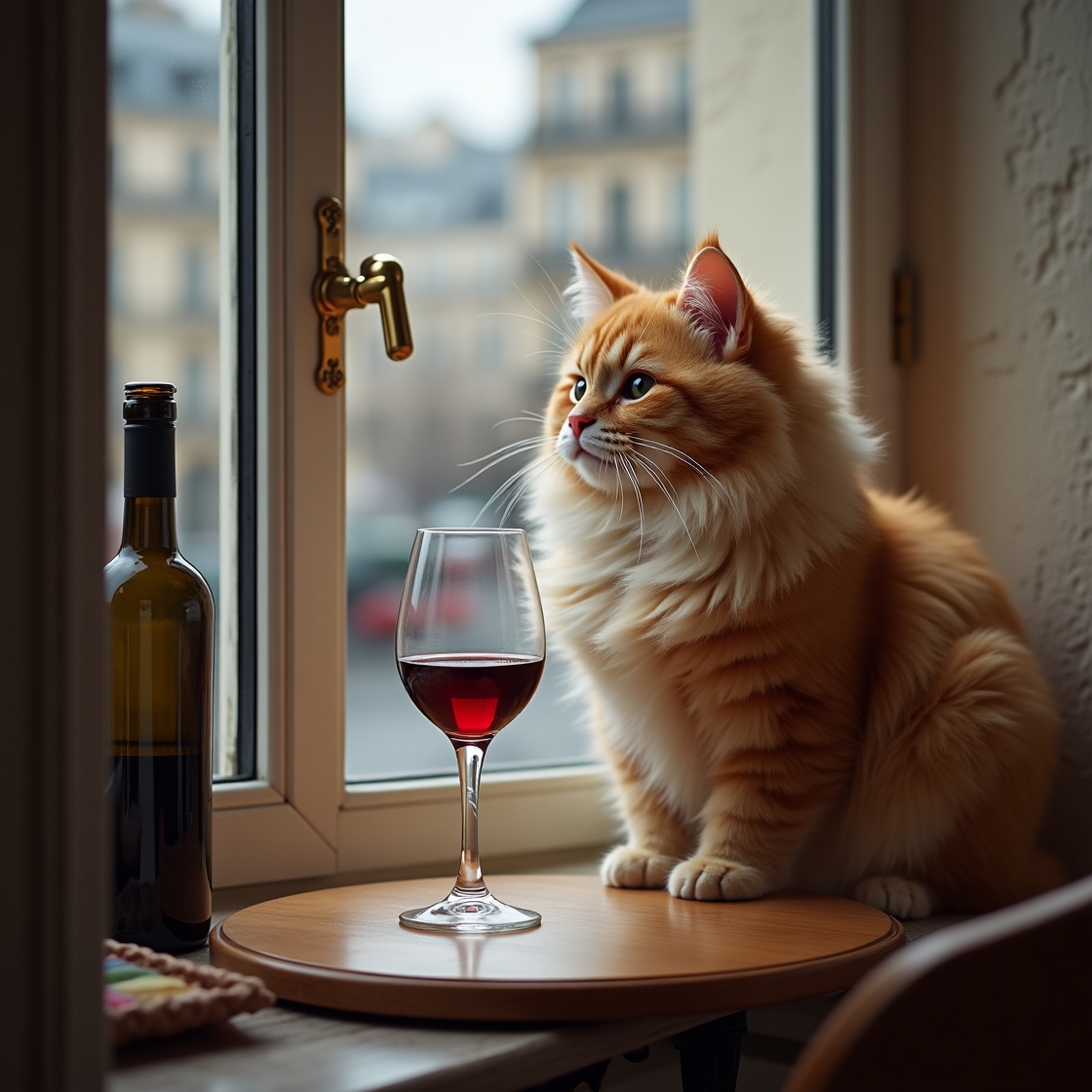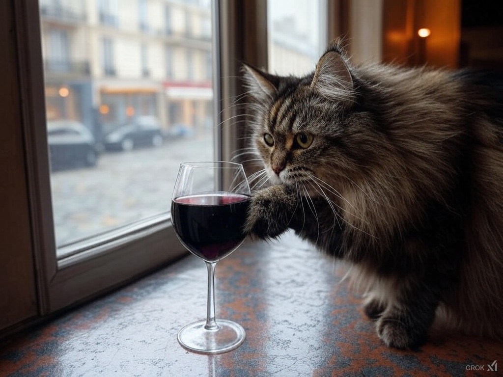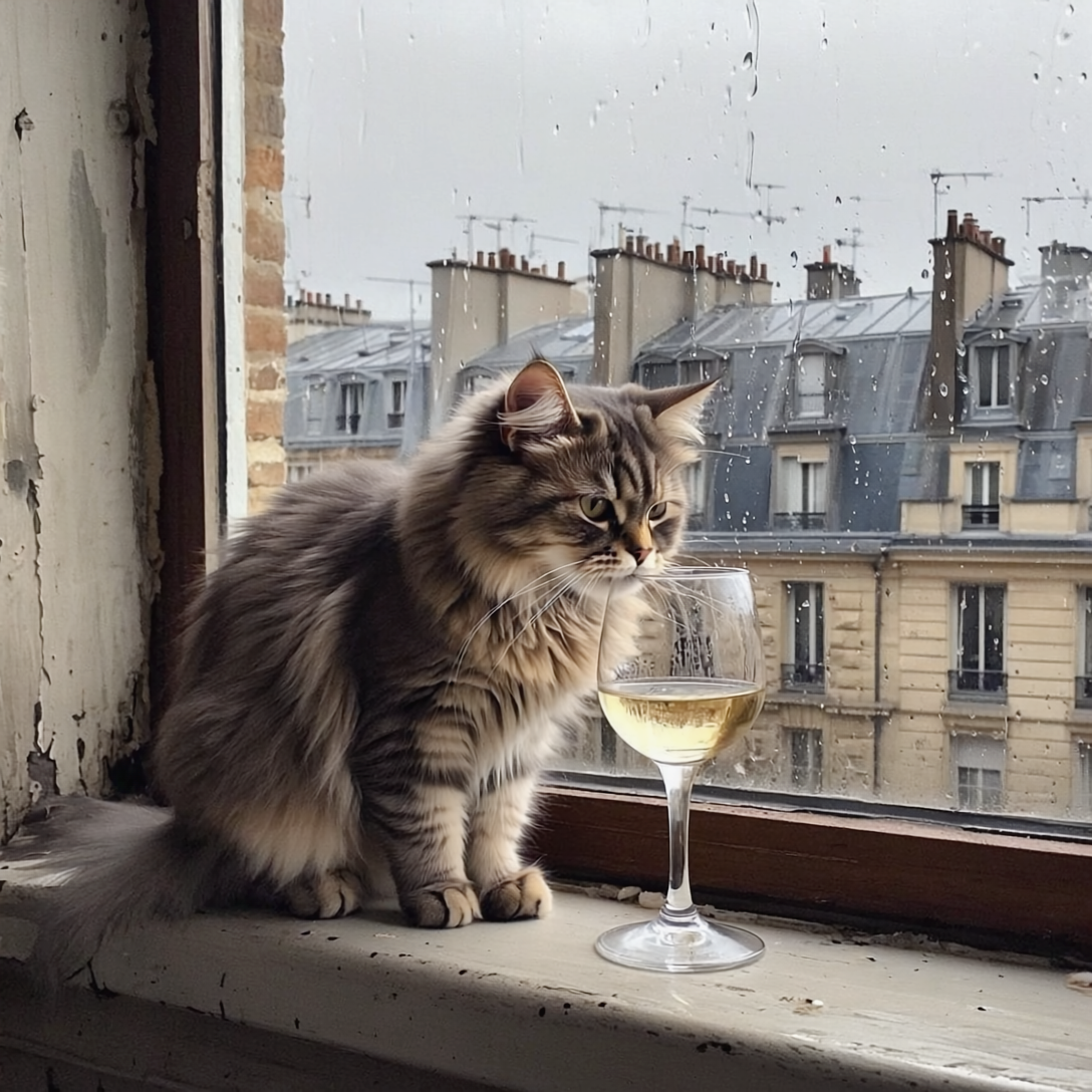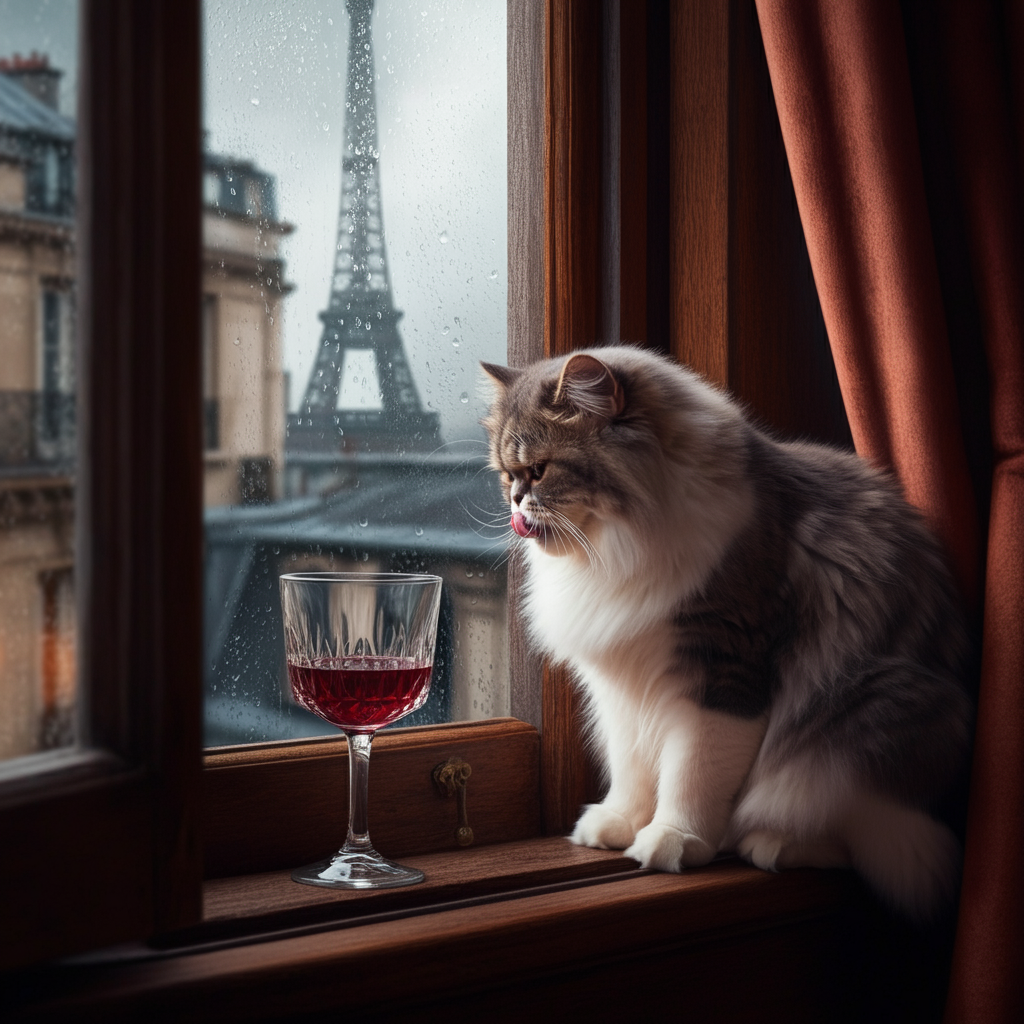 "Generate a realistic image of a fluffy and playful cat sipping red wine by a window on a rainy day in Paris".