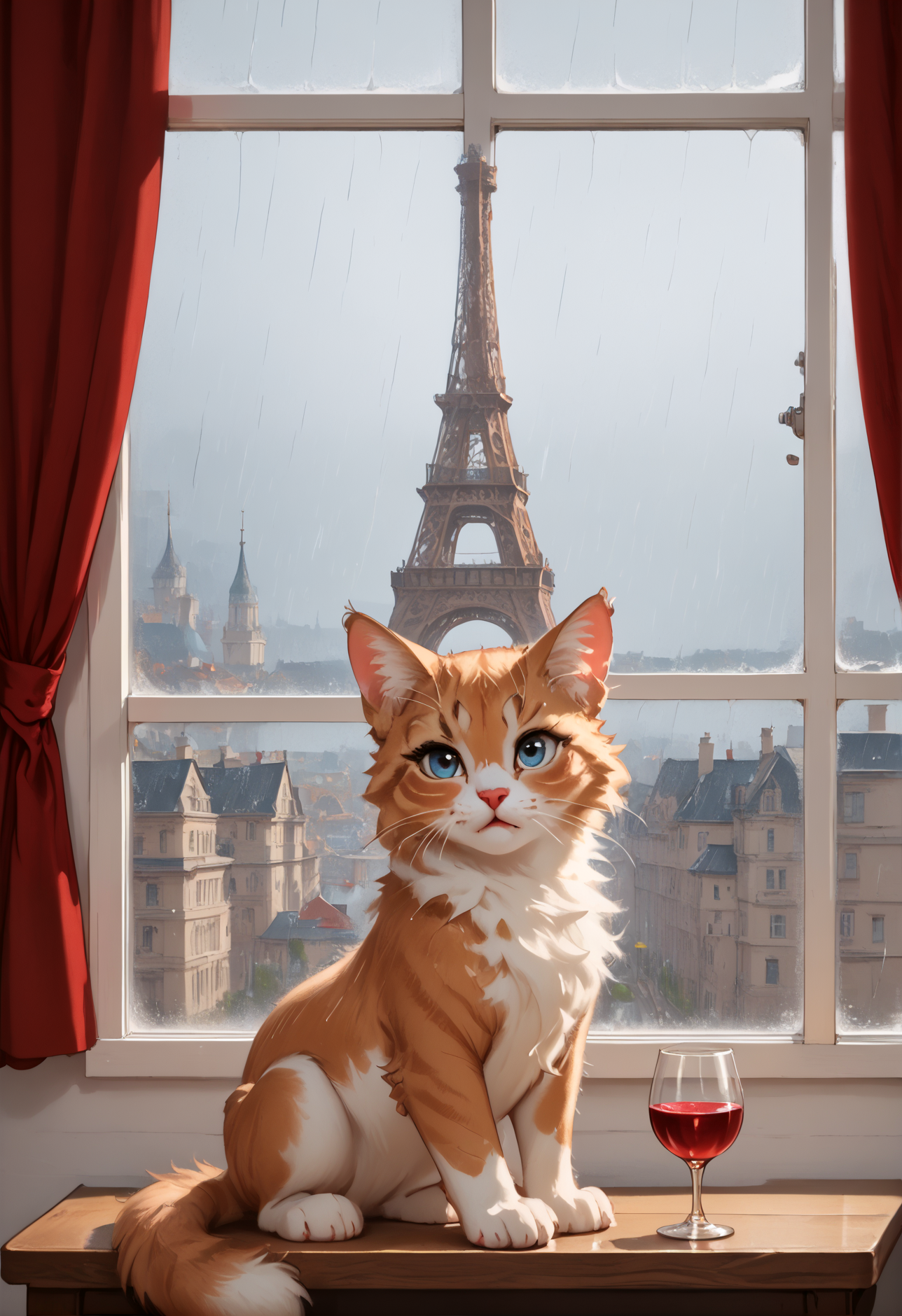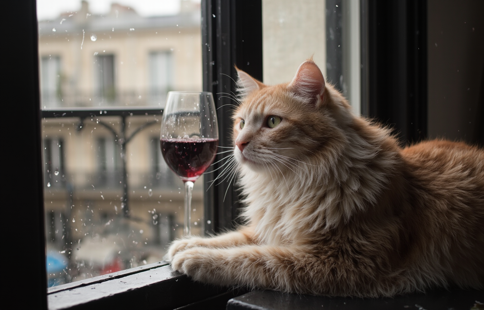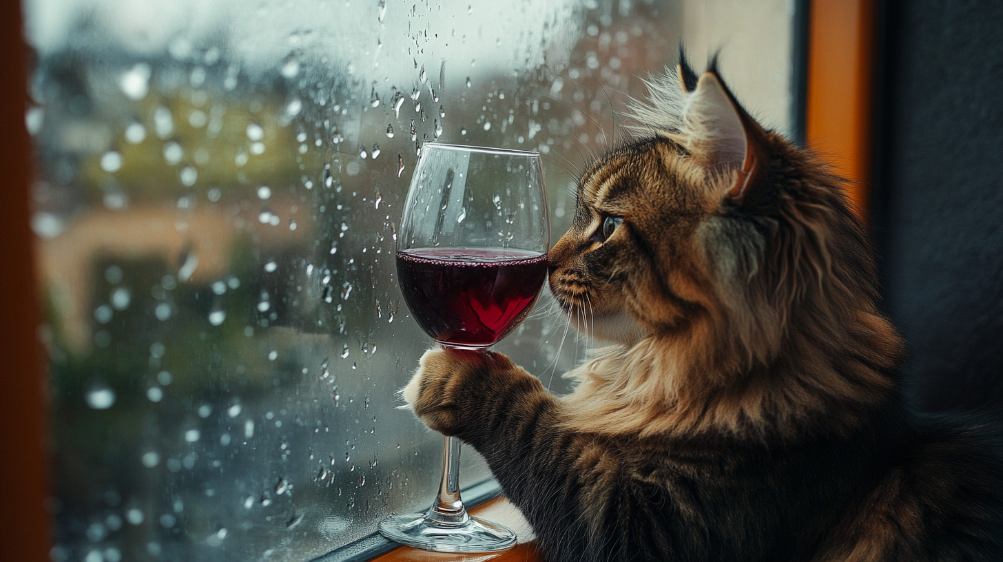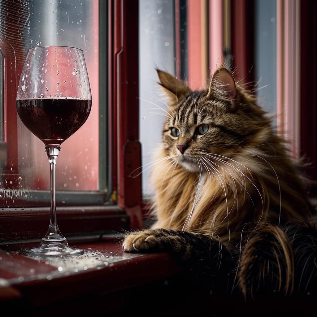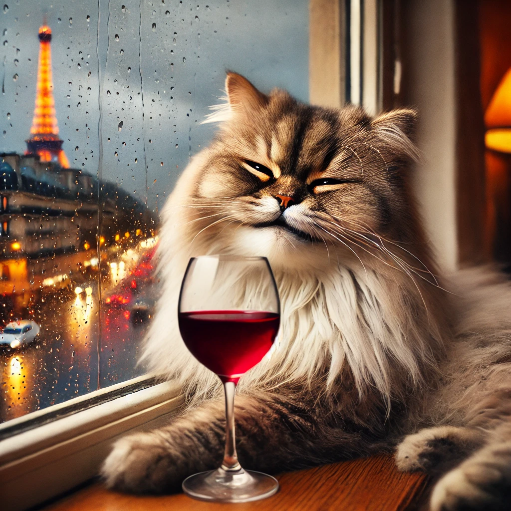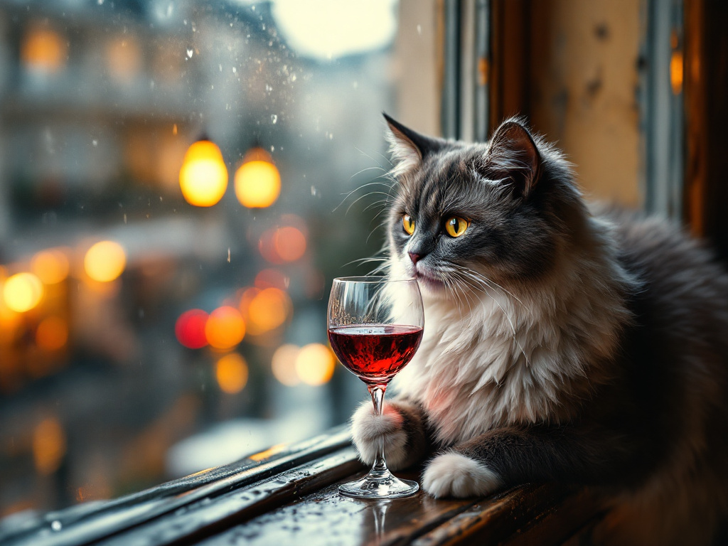 "Generate a realistic image of a fluffy and playful cat sipping red wine by a window on a rainy day in Paris".