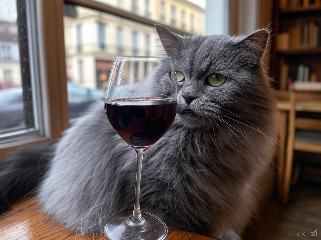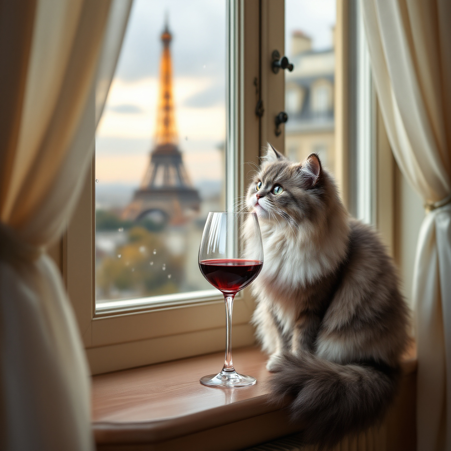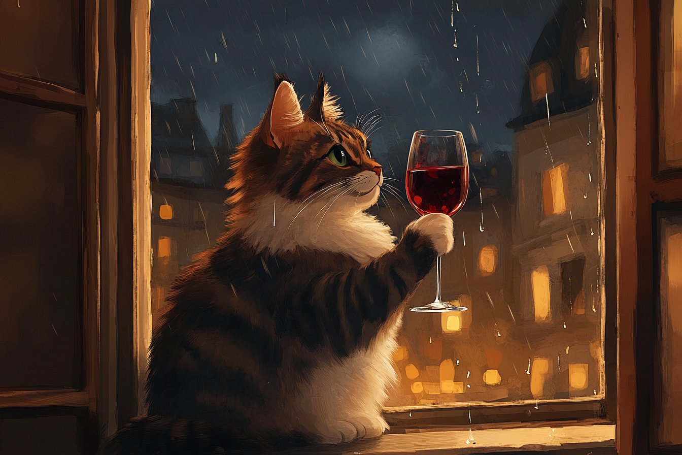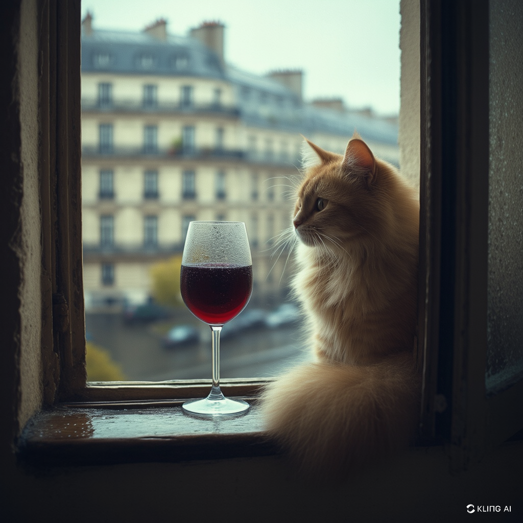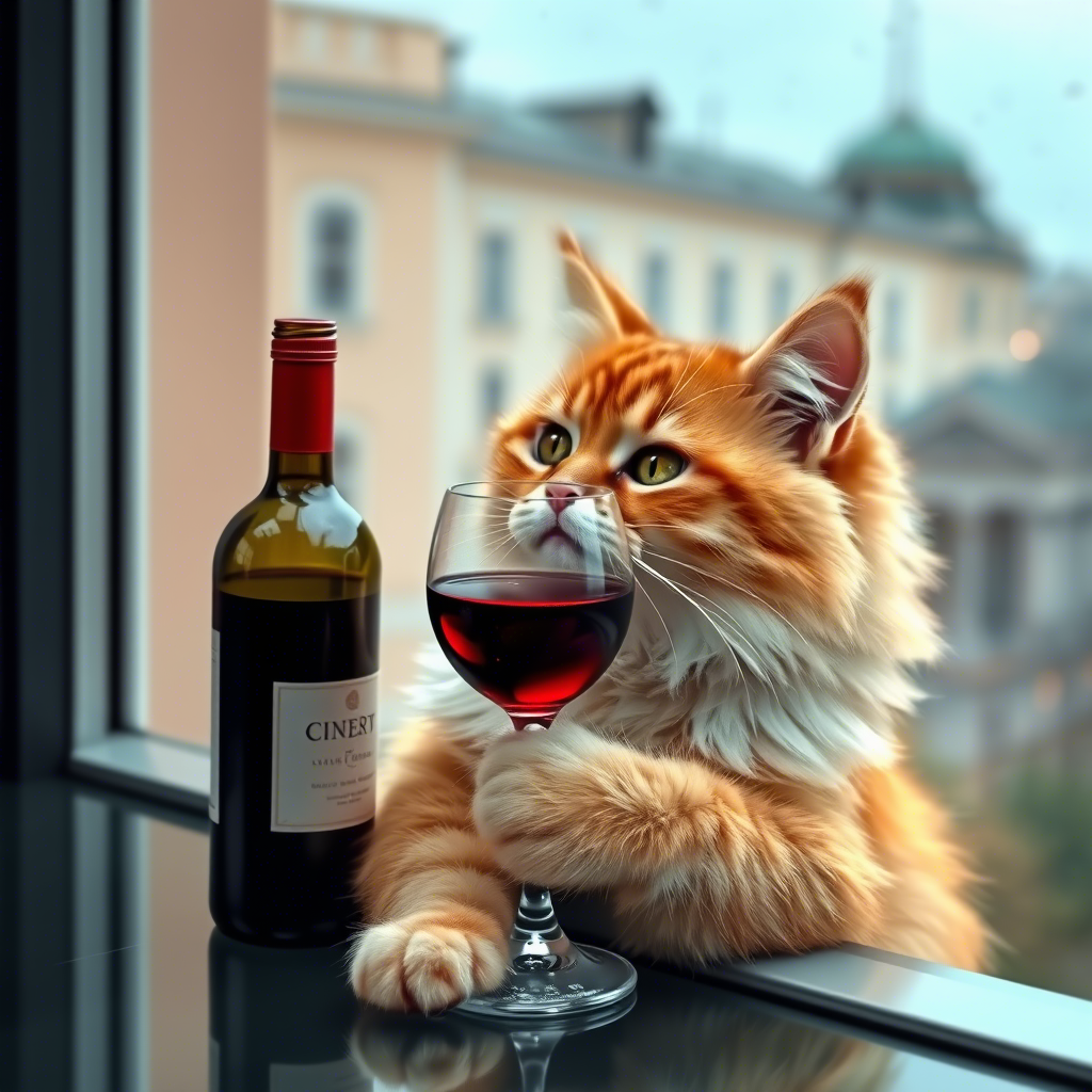 "Generate a realistic image of a fluffy and playful cat sipping red wine by a window on a rainy day in Paris".