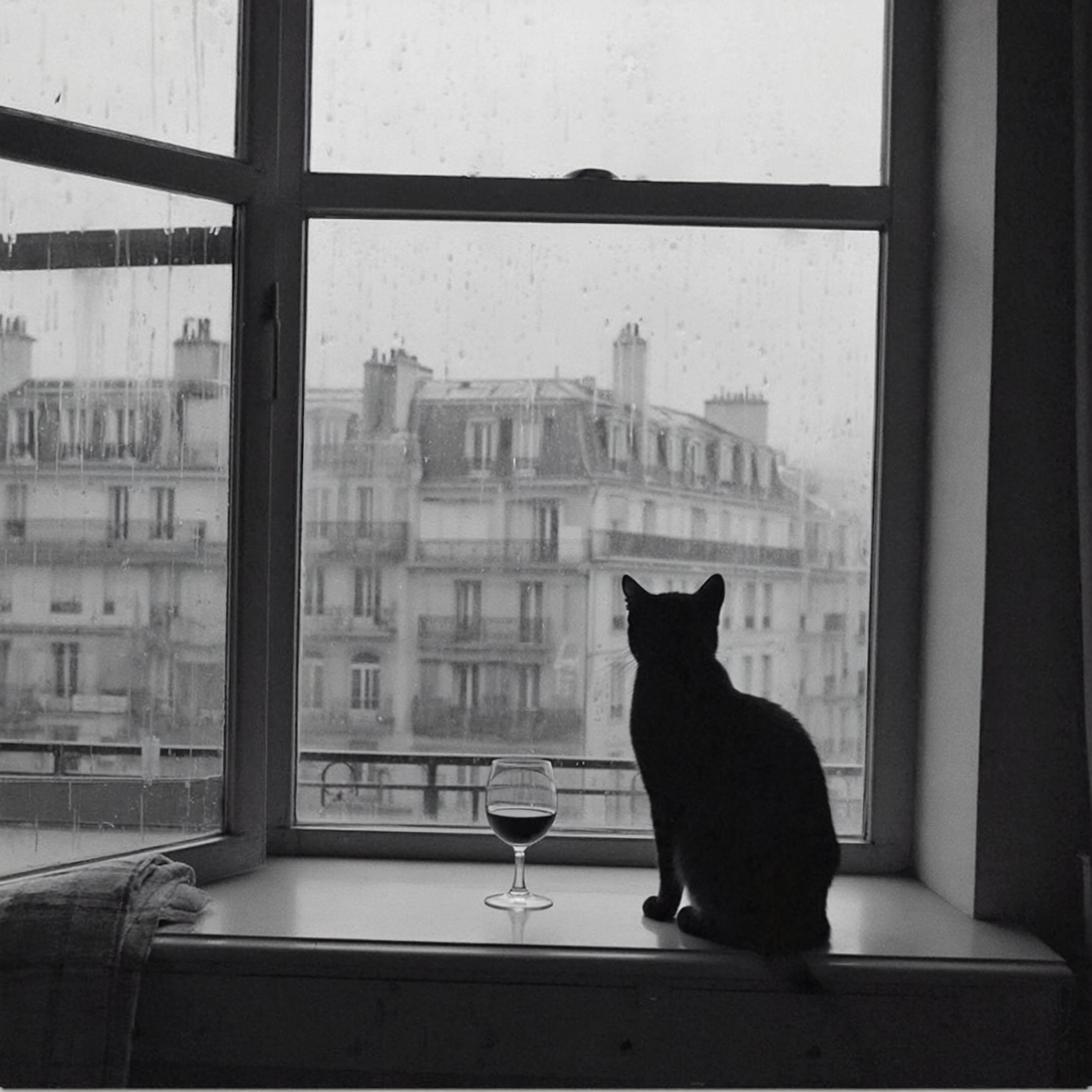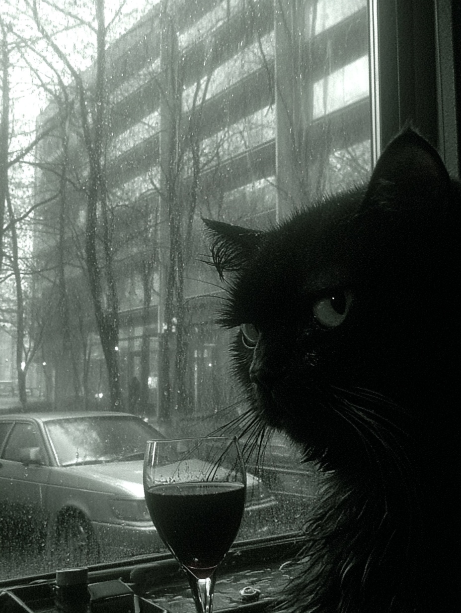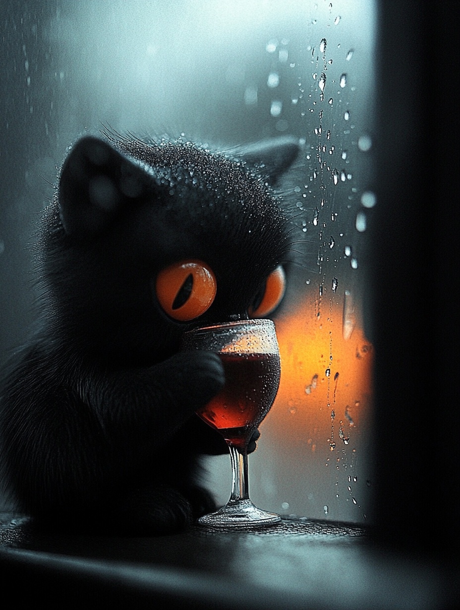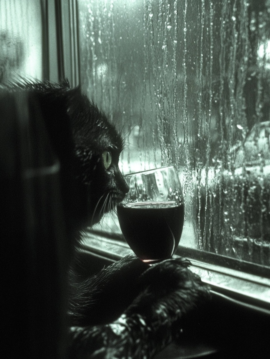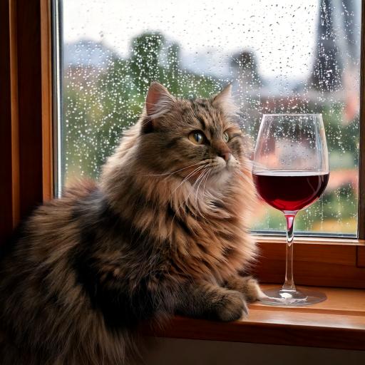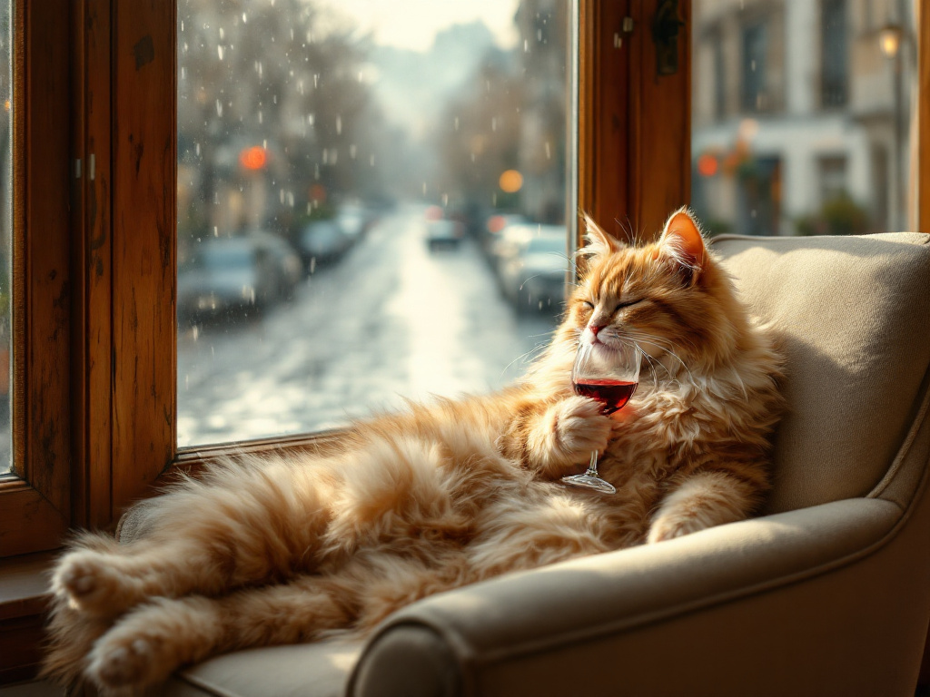 "Generate a realistic image of a fluffy and playful cat sipping red wine by a window on a rainy day in Paris".